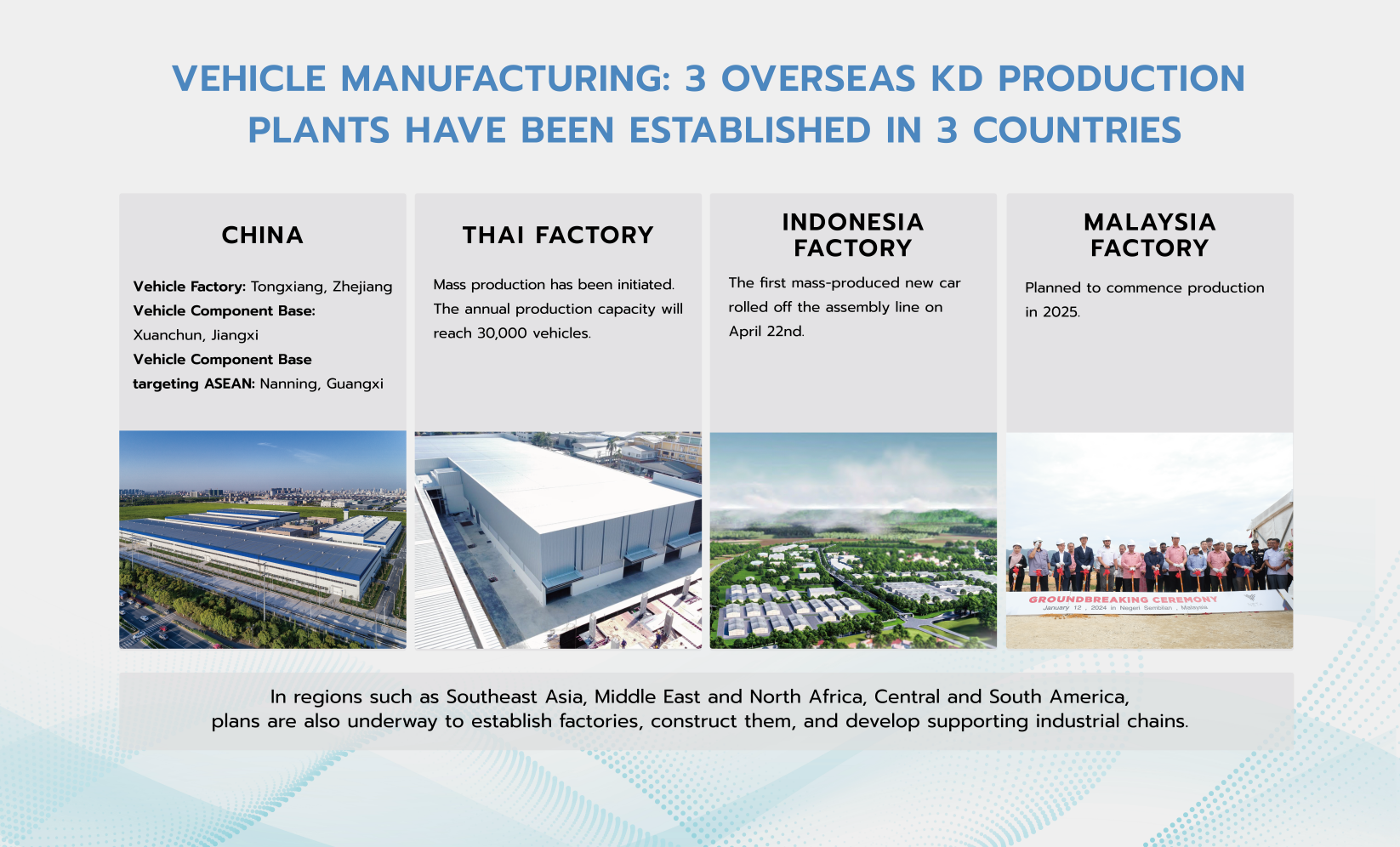 นอกจากนี้ NETA ยังขยายความร่วมมือกับอุตสาหกรรมต่างประเทศ ในปี 2024 NETA กลายเป็นผู้ผลิตรถยนต์รุ่นล่าสุดที่สร้างโรงงานที่ต่างประเทศสามแห่งใหญ่ในประเทศไทย, อินโดนีเซีย และมาเลเซีย โดยส่งออกผลิตภัณฑ์และเทคโนโลยีให