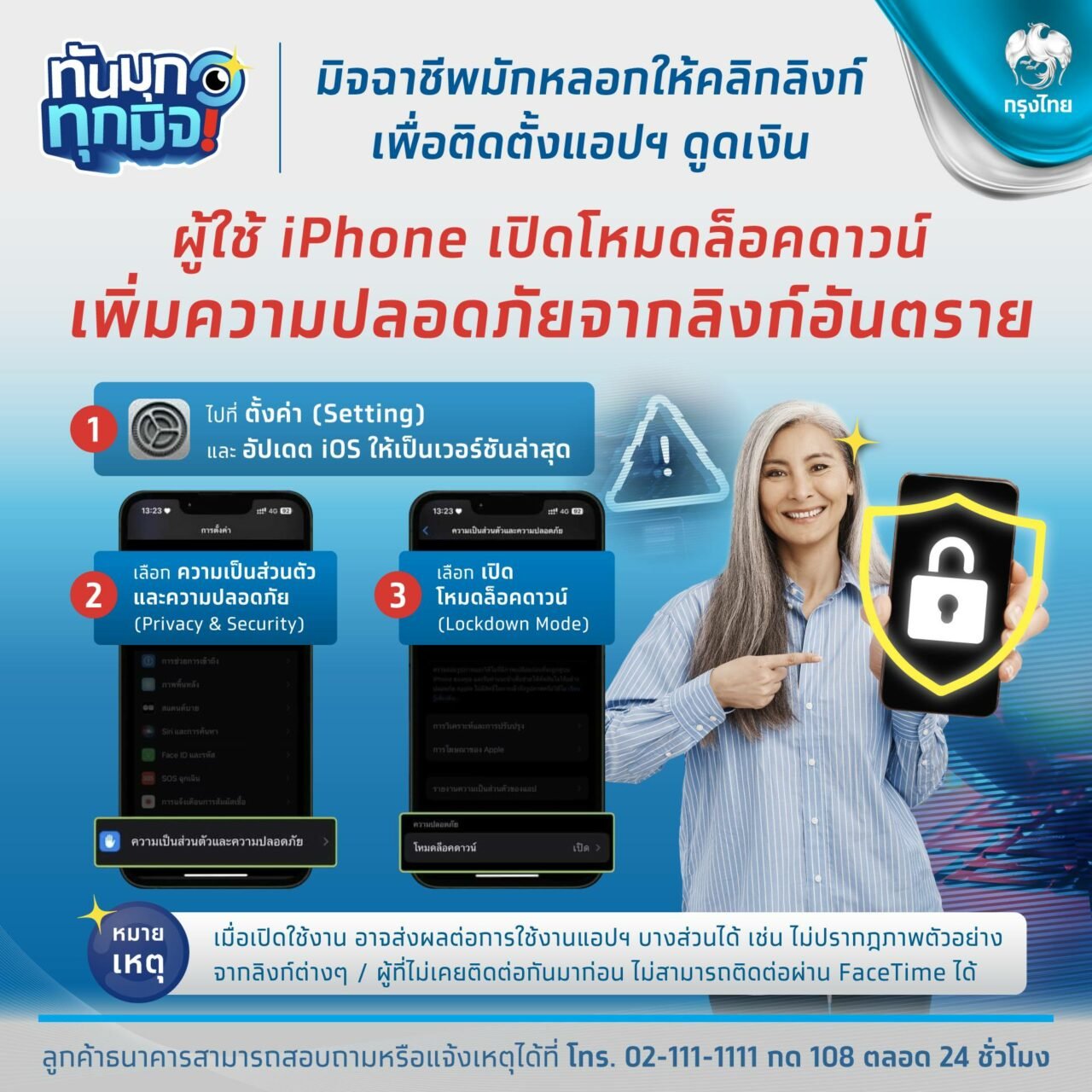 “ธนาคารกรุงไทย” แจ้งเตือนผ่านเฟซบุ๊กเพจ Krungthai Care ระบุว่า มิจฉาชีพมักหลอกให้คลิกลิงก์ เพื่อติดตั้งแอปดูดเงิน ให้ผู้ใช้ไอโฟน iPhone เปิดโหมดล็อกดาวน์ เพื่อความปลอดภัยจากลิงก์อันตราย