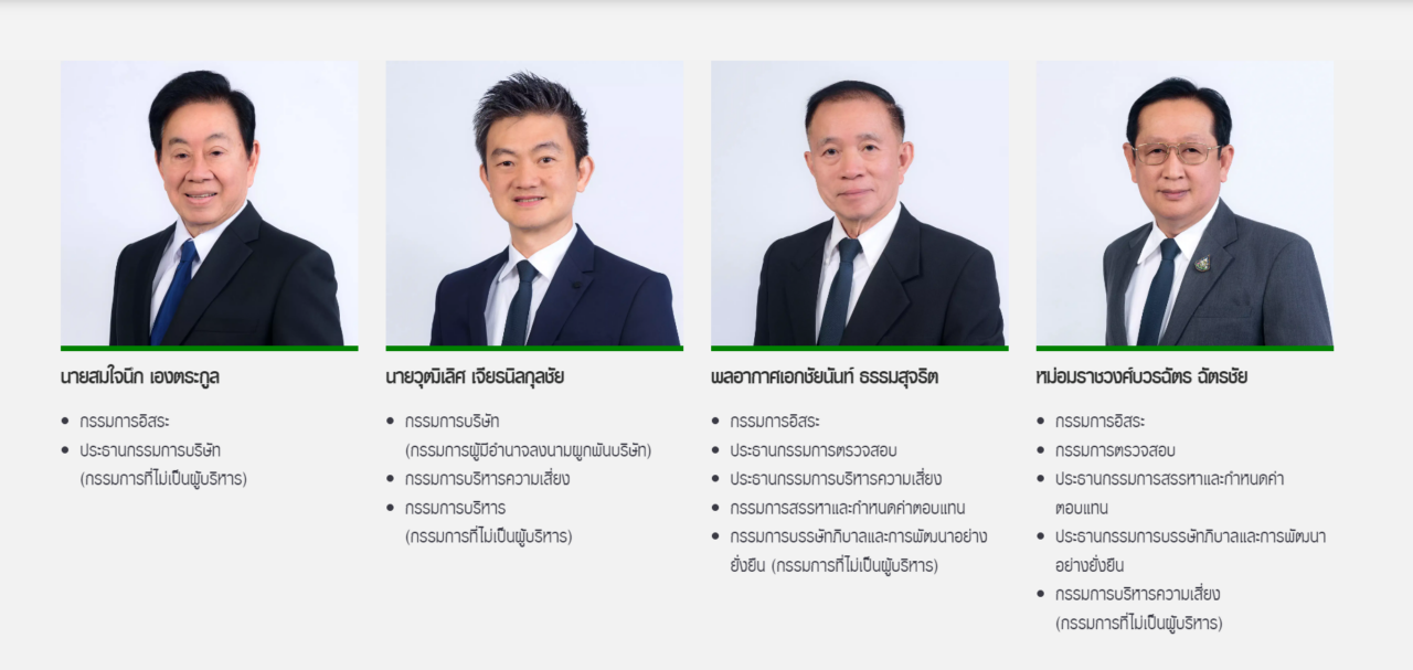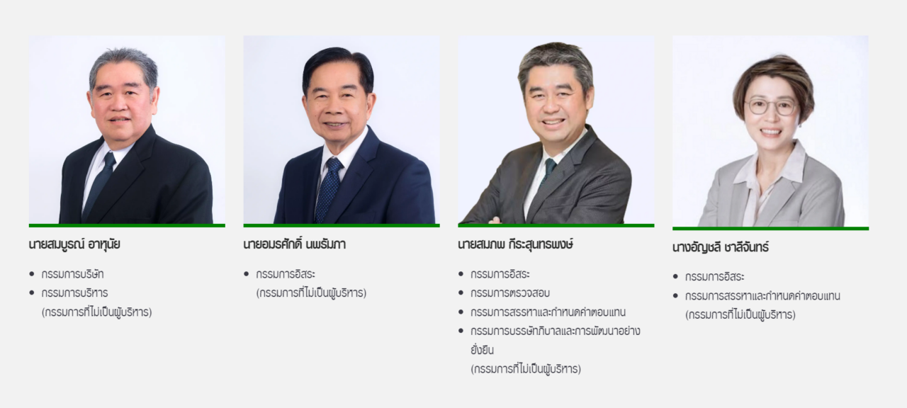 นายสมใจนึก เองตระกูล ประธานกรรมการบริษัท (กรรมการผู้มีอำนาจลงนาม)นายวุฒิเลิศ เจียรนิลกุลชัย กรรมการ (กรรมการผู้มีอำนาจลงนาม)นายสมบูรณ์ อาหุนัย กรรมการ (กรรมการผู้มีอำนาจลงนาม)นางอัญชลี ชาลีจันทร์ กรรมการ (กรรมการผู้มีอำนาจลงนาม)พล.อ.อ.ชัยนันท์ ธรรมสุจริต กรรมการอิสระ,ประธานกรรมการตรวจสอบม.ร.ว.บวรฉัตร ฉัตรชัย กรรมการอิสระ,กรรมการตรวจสอบนายสมภพ กีระสุนทรพงศ์ กรรมการอิสระ,กรรมการตรวจสอบนายอมรศักดิ์ นพรัมภา กรรมการอิสระนายเจริญชัย ประเทืองสุขศรี กรรมการนายชัชวาลย์ เจียรวนนท์ กรรมการนายวสุ กลมเกลี้ยง กรรมการนายฉัตรพล ศรีประทุม กรรมการ