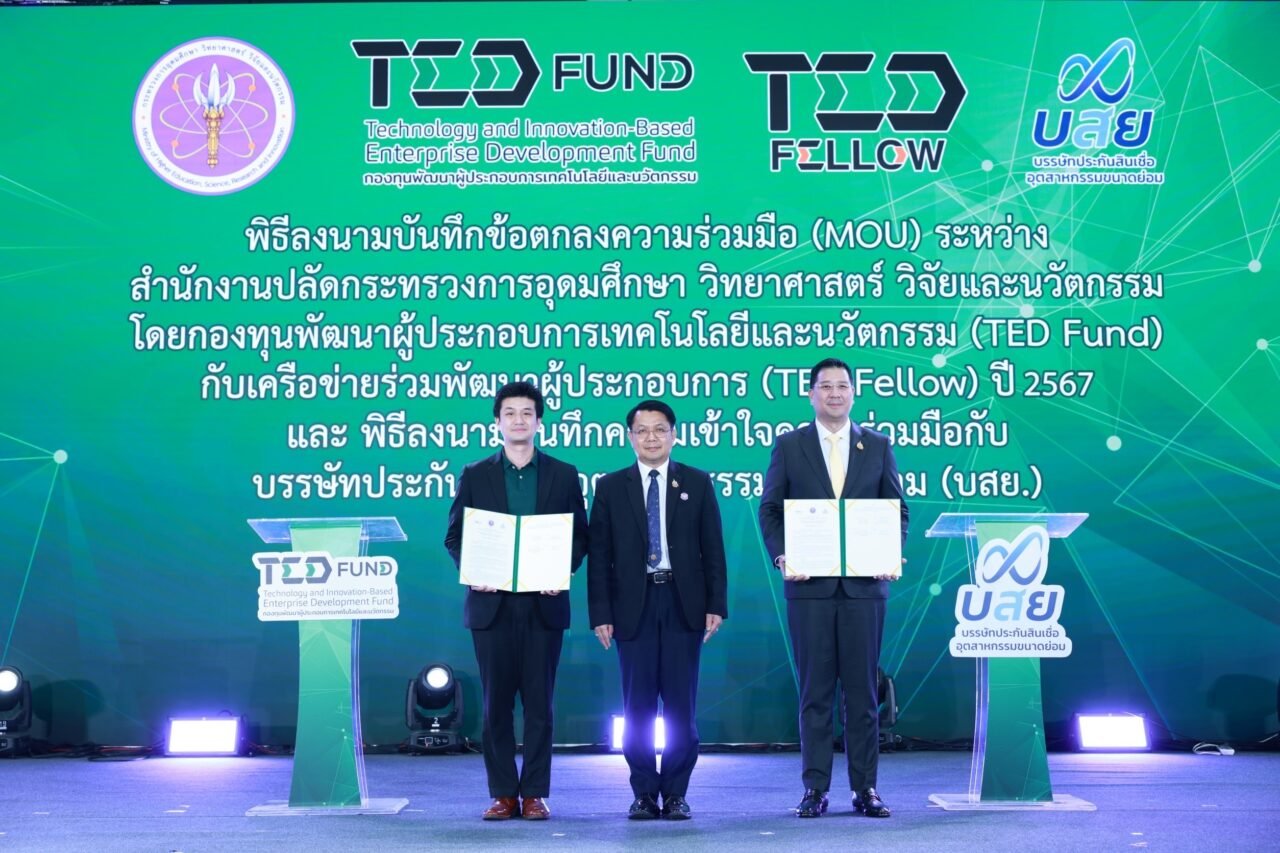 นายชาญวิทย์ ตรีเดช ผู้จัดการกองทุนพัฒนาผู้ประกอบการเทคโนโลยีและนวัตกรรม หรือ TED Fund กระทรวงการอุดมศึกษา วิทยาศาสตร์ วิจัยและนวัตกรรม (อว.) เปิดเผยว่า TED Fund ได้ลงนามความร่วมมือกับ เครือข่ายร่วมพัฒนาผู้ประกอบการ (TED Fellow) รวม 10 หน่วยงาน เพื่อสนับสนุนผู้ประกอบการเทคโนโลยีและนวัตกรรมรุ่นใหม่ให้เข้าถึงแหล่งเงินทุน เสริมศักยภาพ ยกระดับความสามารถในการแข่งขันและได้ร่วมลงนามบันทึกความเข้าใจความร่วมมือกับ บรรษัทประกันสินเชื่ออุตสาหกรรมขนาดย่อม หรือ บสย. ส่งเสริมศักยภาพด้านการดำเนินธุรกิจให้แก่ผู้ประกอบการเอสเอ็มอีอีกด้วย