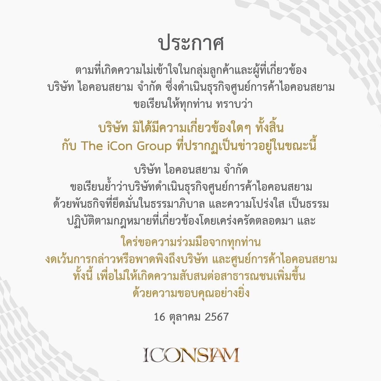 บริษัท ไอคอนสยาม จำกัด ขอเรียนย้ำว่า บริษัทดำเนินธุรกิจศูนย์การค้าไอคอนสยาม ด้วยพันธกิจที่ยึดมั่นในธรรมาภิบาลและความโปร่งใสเป็นธรรม ปฏิบัติตามกฎหมายที่เกี่ยวข้องโดยเคร่งครัดตลอดมา และใคร่ขอความร่วมมือจากทุกท่าน งดเว้นการกล่าวหรือพาดพิงถึง บริษัทและศูนย์การค้าไอคอนสยาม ทั้งนี้ เพื่อให้ไม่ให้เกิดความสับสนต่อสาธารณชนเพิ่มขึ้น