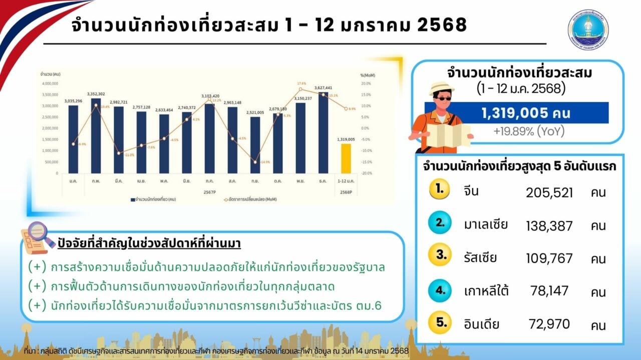สําหรับภาพรวมการท่องเที่ยวต่างชาติที่เดินทางเข้าไทยสะสมตั้งแต่วันที่ 1 ม.ค. – 12 ม.ค. 2568 โดยข้อมูล ณ วันที่ 13 ม.ค. 68 พบว่ามีทั้งสิ้น 1,319,005 คน สร้างรายได้จากการใช้จ่ายของนักท่องเที่ยวต่างชาติแล้วประมาณ 66,089 ล้านบาท โดยจำนวนนักท่องเที่ยวสูงสุด 5 อันดับแรก ได้แก่ จีน 205,521 คน มาเลเซีย 138,387 คน รัสเซีย 109,767 คน เกาหลีใต้ 78,147 คน และอินเดีย