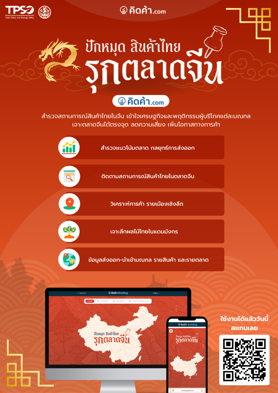 ทั้งนี้ การให้บริการข้อมูลสถานการณ์เศรษฐกิจการค้าระหว่างไทยและจีนรายมณฑล “คิดค้า Briefing” หัวข้อ “ปักหมุดสินค้าไทย รุกตลาดจีน” จะเป็นเครื่องมือสำคัญในการสนับสนุนข้อมูลแก่ผู้ประกอบการ ช่วยให้วางแผนการส่งออกได้อย่างรอบคอบและแม่นยำ เพิ่มขีดความสามารถในการแข่งขัน และช่วยขับเคลื่อนนโยบายเศรษฐกิจการค้าของประเทศ ตลอดจนเสริมสร้างความร่วมมือทางเศรษฐกิจ และกระชับความสัมพันธ์ของทั้งสองประเทศให้แน่นแฟ้นยิ่งขึ้น