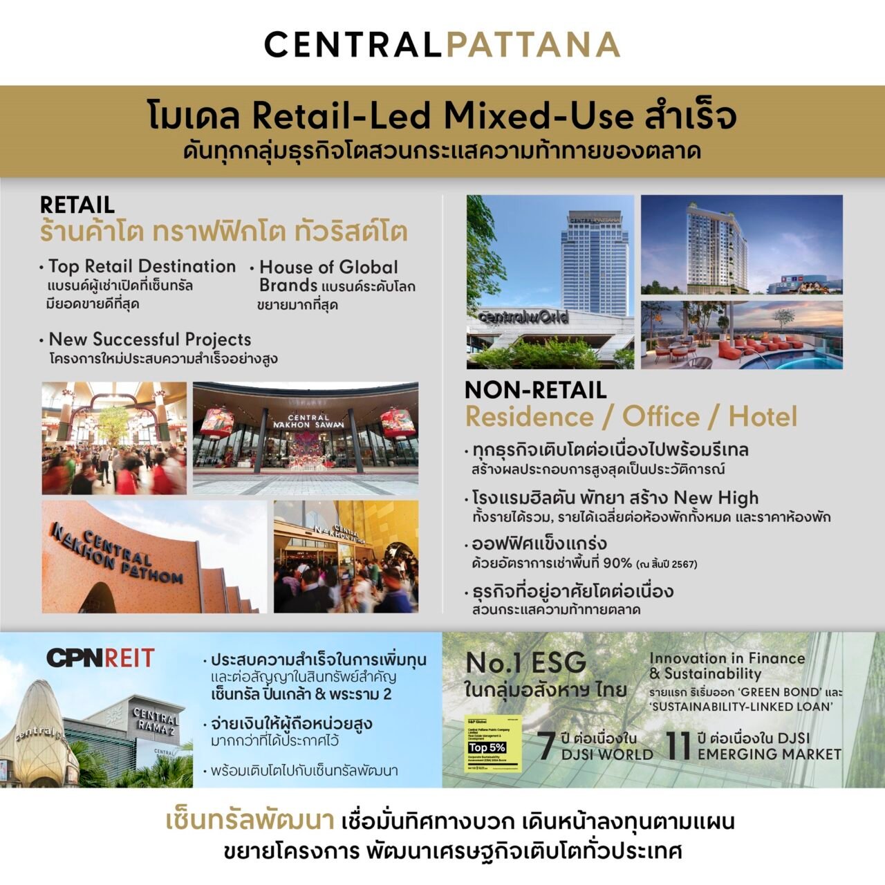 น.ส.วัลยา จิราธิวัฒน์ กรรมการผู้จัดการใหญ่และประธานเจ้าหน้าที่บริหารบมจ.เซ็นทรัลพัฒนา หรือ ซีพีเอ็น เปิดเผยว่า ในปี67 บริษัทมีรายได้ 51,843 ล้านบาท และกำไรสุทธิ 16,729 ล้านบาท เติบโต 11% จากปีก่อนหน้า สูงสุดเป็นประวัติการณ์ จากธุรกิจค้าปลีกที่เป็นหัวใจสำคัญในการเชื่อมโยงกับธุรกิจหลักอื่นๆ ได้แก่ ที่อยู่อาศัย,โรงแรม และอาคารสำนักงาน หรือรูปแบบมิกซ์ยูส ทำให้สร้างผลตอบแทนผู้ถือหุ้นสูงถึง 15% รวมทั้งประกาศจ่ายปันผลสูงสุดเป็นประวัติการณ์ 2.1 บาทต่อหุ้น
