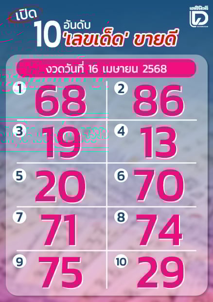 เมื่อจัดลำดับความนิยมของเลขดัง 10 อันดับ พบมีดังนี้ อันดับ 1 เลข 68 อันดับ 2 เลข 86 อันดับ 3 เลข 19 อันดับ 4 เลข 13 อันดับ 5 เลข 20 อันดับ 6 เลข 70 อันดับ 7 เลข 71 อันดับ 8 เลข 74 อันดับ 9 เลข 75 และอันดับ 10 เลข 29