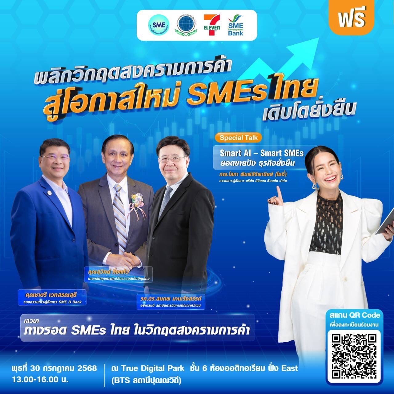 สมาคมผู้สื่อข่าวส่งเสริมเอสเอ็มอีไทย ร่วมกับสมาคมการค้าปลีกและเอสเอ็มอีทุนไทย และภาคีเครือข่าย ธนาคารพัฒนาวิสาหกิจขนาดกลางและขนาดย่อมแห่งประเทศไทย หรือ SME D Bank และร้านสะดวกซื้อ 7-11 จัดงานสัมมนาหัวข้อ “พลิกวิกฤติสงครามการค้า สู่โอกาสใหม่ SMEs ไทยเติบโตอย่างยั่งยืน” เพื่อให้ผู้ประกอบการไทยเข้าใจแนวโน้มธุรกิจในช่วงวิกฤติและหาโอกาสเติบโตอย่างมั่นคงในยุคดิจิทัล โดยจะพูดถึงกลยุทธ์รับมือกับความท้าทายจากสงครามการค้า รวมถึงเทคโนโลยี AI ที่ช่วยสร้างการเติบโตทางธุรกิจอย่างยั่งยืน ในวันพุธที่ 30 ก.ค.68 เวลา 13.00-16.00 น. ณ True Digital Park ชั้น 6 ห้องออดิทอเรียม ฝั่ง East (BTS สถานีปุณณวิถี)