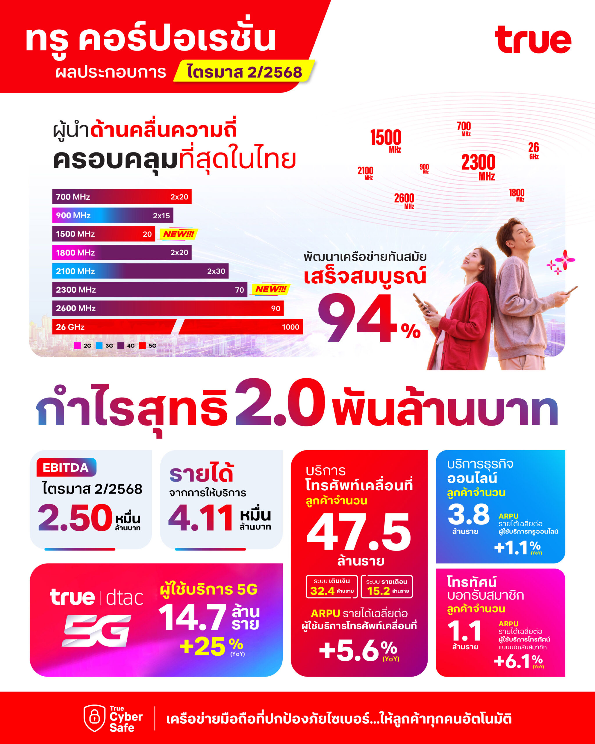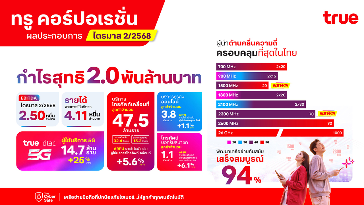 บริษัท ทรู คอร์ปอเรชั่น จำกัด (มหาชน) รายงานผลกำไรหลังหักภาษีประจำไตรมาส 2/2568 เป็นมูลค่ากว่า 2.0 พันล้านบาท ซึ่งนับเป็นไตรมาสที่ 2 ติดต่อกันที่ผลการดำเนินงานของบริษัทพลิกกลับมาทำกำไร