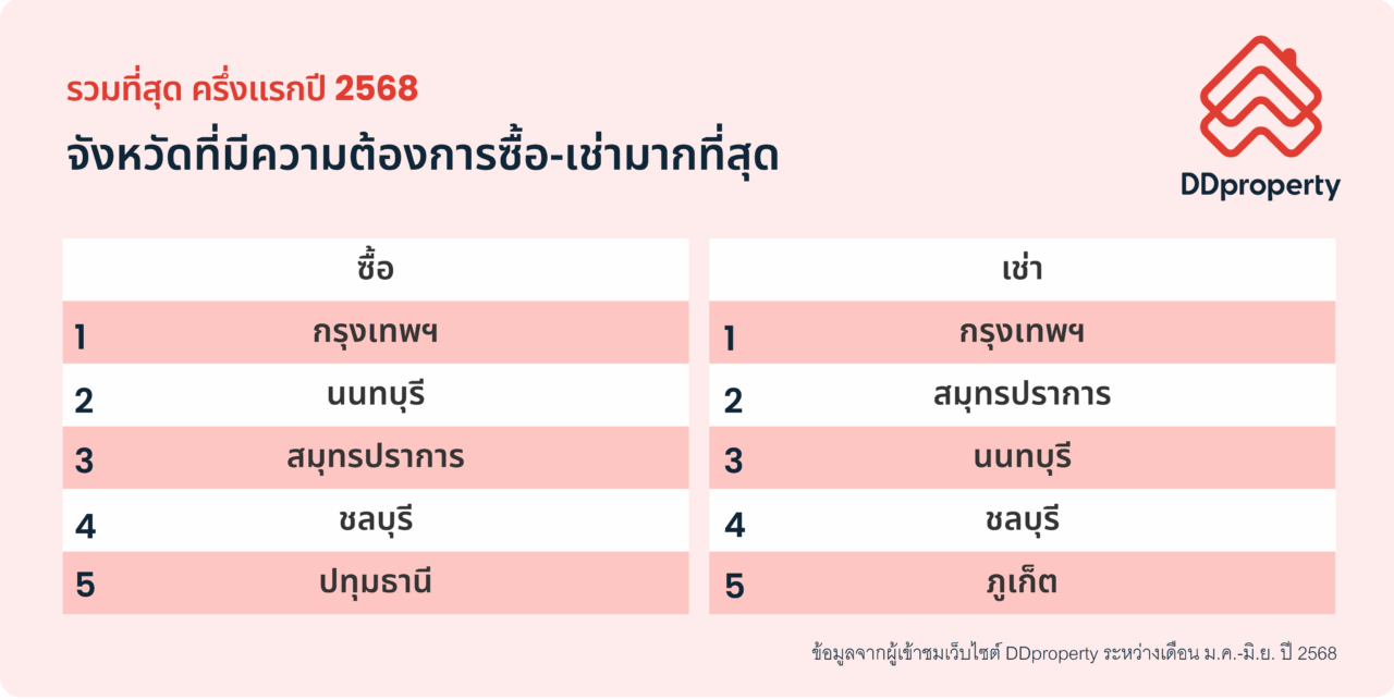กรุงเทพมหานครยังคงเป็นจังหวัดที่ได้รับความต้องการซื้อ/เช่าที่อยู่อาศัยมากที่สุดในช่วงครึ่งปีแรก โดยจังหวัดที่ได้รับความต้องการซื้อรองลงมา ได้แก่ อันดับ 2 นนทบุรี,อันดับ 3 สมุทรปราการ,อันดับ 4 ชลบุรี และอันดับ 5 ปทุมธานี จะเห็นได้ว่าจังหวัดปริมณฑลยังคงได้รับความนิยมในกลุ่มผู้ซื้อ โดยได้อานิสงส์จากการขยายโครงข่ายรถไฟฟ้าเชื่อมต่อการเดินทางระหว่างใจกลางกรุงเทพฯ และจังหวัดปริมณฑลให้สะดวกมากขึ้น ส่งผลให้ผู้บริโภคหันไปเลือกซื้อที่อยู่อาศัยในแถบชานเมืองที่มีราคาย่อมเยากว่าแทน