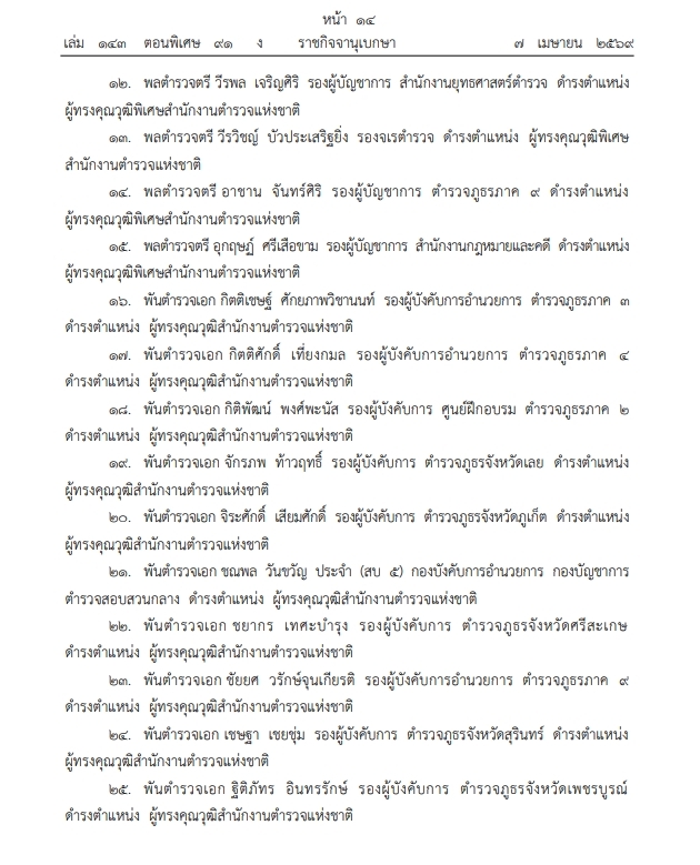 13. พลตํารวจตรี วีรวิชญ์ บัวประเสริฐยิ่ง รองจเรตํารวจ ดํารงตําแหน่ง ผู้ทรงคุณวุฒิพิเศษ สํานักงานตําารวจแห่งชาติ