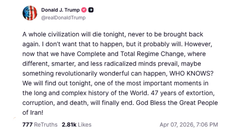 ในเวลาไล่เลี่ยกัน ปธน.โดนัลด์ ทรัมป์ โพสต์ข้อความที่สร้างแรงสั่นสะเทือนไปทั่วโลก ผ่านแพลตฟอร์มทรูธโซเชียลโดยระบุว่า "อารยธรรมทั้งหมดกำลังจะตายในคืนนี้ และจะไม่มีวันกลับมาเหมือนเดิมอีก" ทรัมป์ยังเน้นย้ำถึงการเปลี่ยนแปลงระบอบการปกครอง โดยกล่าวว่ายุคสมัยแห่งการรีดไถ การคอร์รัปชัน และความตายตลอด 47 ปีที่ผ่านมา (นับตั้งแต่ปฏิวัติอิหร่านปี 1979) กำลังจะสิ้นสุดลง และทิ้งท้ายด้วยประโยคที่ว่า "คืนนี้คือช่วงเวลาที่สำคัญที่สุดในประวัติศาสตร์โลก ขอพระเจ้าอวยพรประชาชนที่ยิ่งใหญ่ของอิหร่าน"