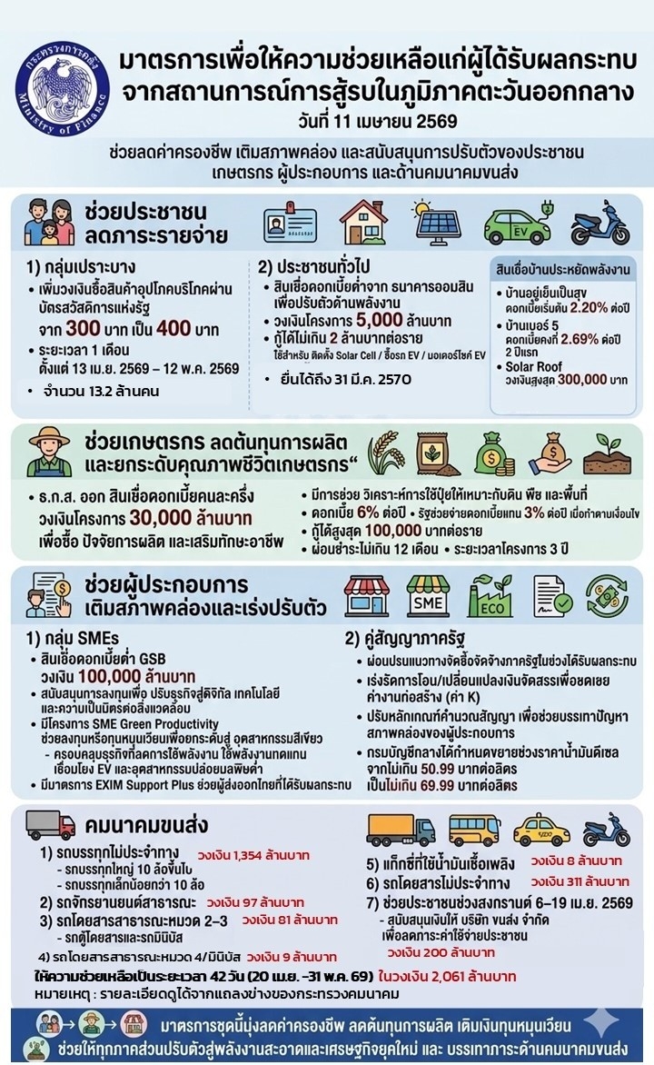 ‘คลัง’ จัดชุดใหญ่ คลอดมาตรการให้ความช่วยเหลือประชาชนและผู้ประกอบการ ภาคขนส่ง เกษตรกร เพื่อบรรเทาผลกระทบจากสถานการณ์การสู้รบในภูมิภาคตะวันออกกลางวันนี้ (11 เม.ย.2569) นายเอกนิติ  นิติทัณฑ์ประภาศ รองนายกรัฐมนตรี และรมว.คลัง กล่าวว่า คณะรัฐมนตรีมีมติเห็นชอบมาตรการให้ความช่วยเหลือ แก่ผู้ที่ได้รับผลกระทบจากสถานการณ์การสู้รบในภูมิภาคตะวันออกกลาง เพื่อเป็นการบรรเทาผลกระทบ และป้องกันความเสี่ยงทางเศรษฐกิจจากสถานการณ์ดังกล่าว ที่อาจส่งผลให้เกิดภาวะเศรษฐกิจชะลอตัวควบคู่กับอัตราเงินเฟ้อที่พุ่งสูงขึ้น (Stagflation) ซึ่งจะส่งผลกระทบต่อทุกภาคส่วน
